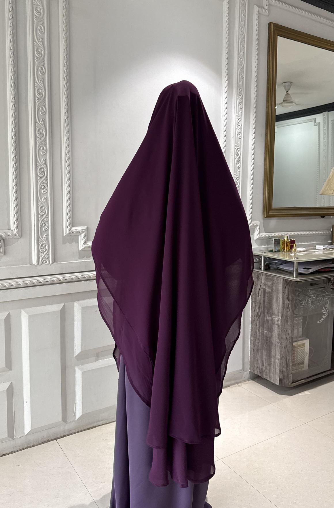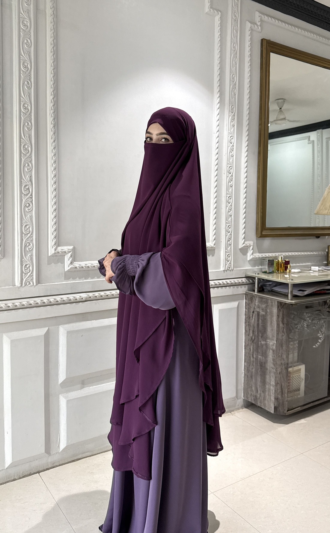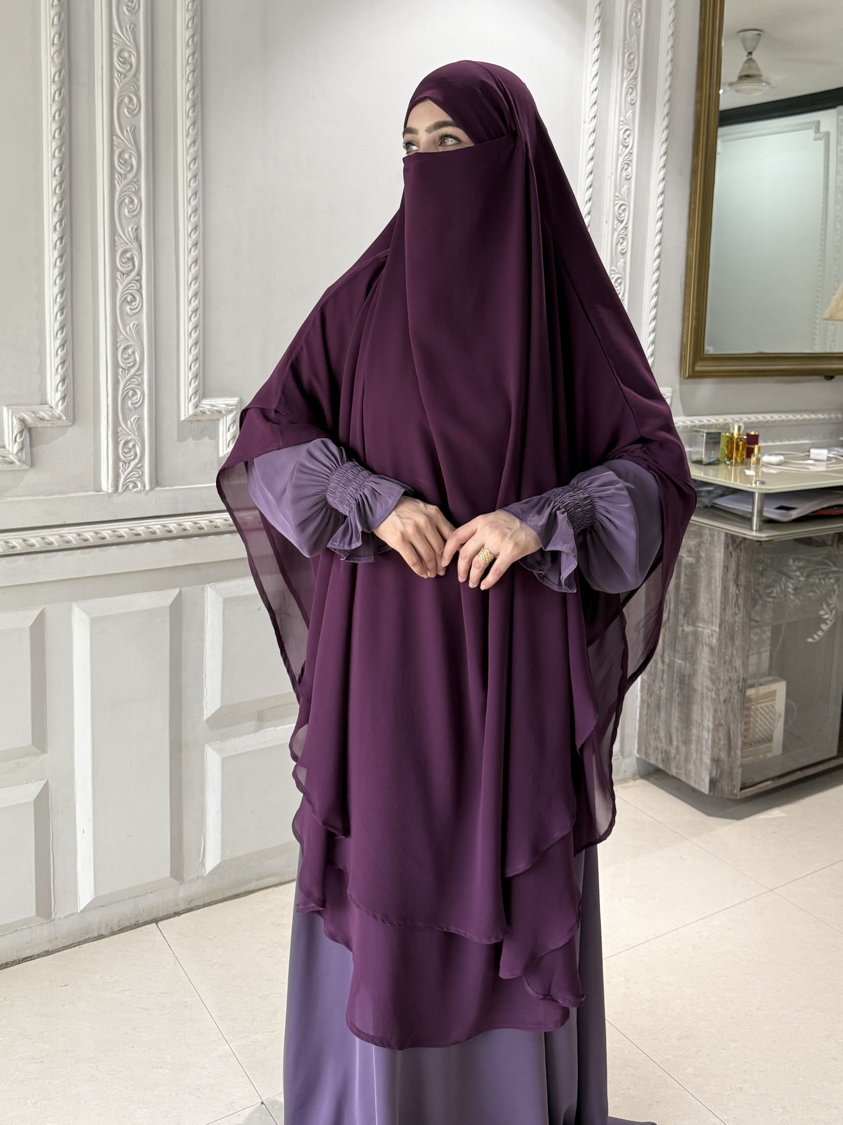 The Jannah Abaya is a beautiful reflection of grace, modesty, and refined elegance. Crafted from imported Firdos fabric, the abaya offers a smooth, luxurious texture with a graceful flow that ensures both comfort and sophistication. It is paired with a double-layer khimar made from premium georgette fabric, providing enhanced coverage with a soft, airy drape.